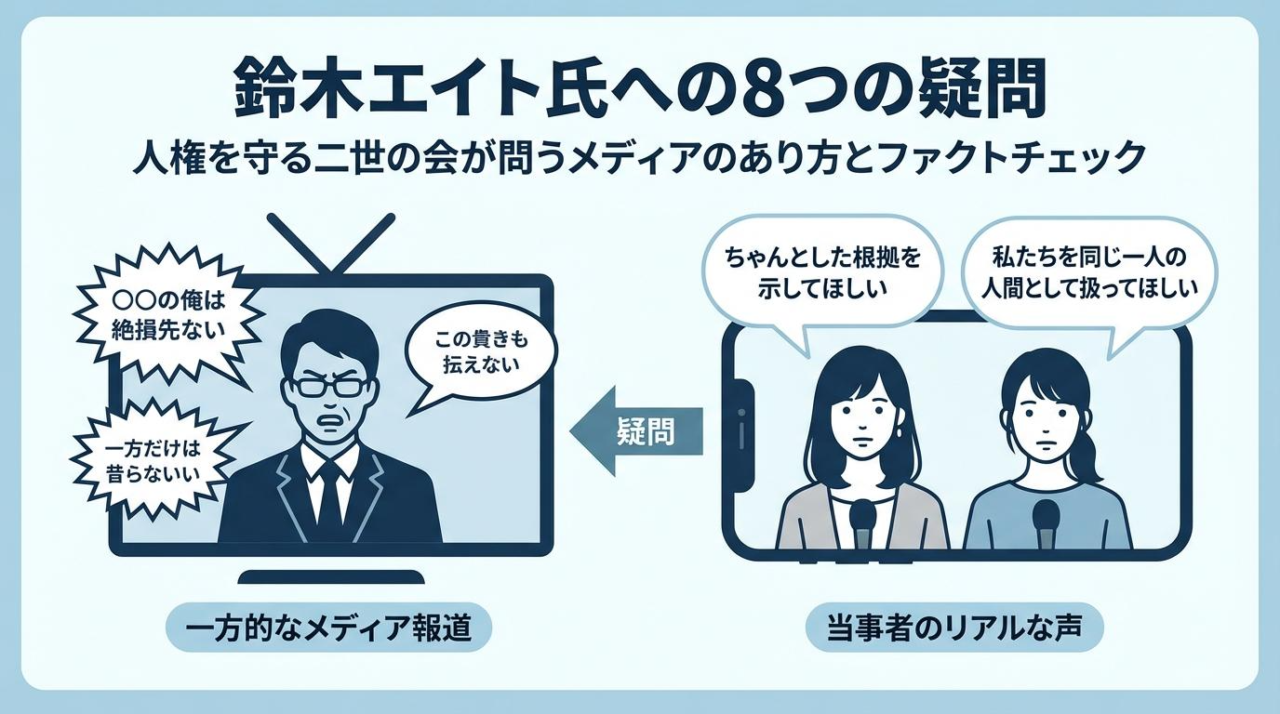 いかがでしたでしょうか。今回は「人権を守る二世の会」の女性たちが鈴木エイト氏に突きつけた8つの疑問を通して、現在の報道のあり方について考えてみました。
