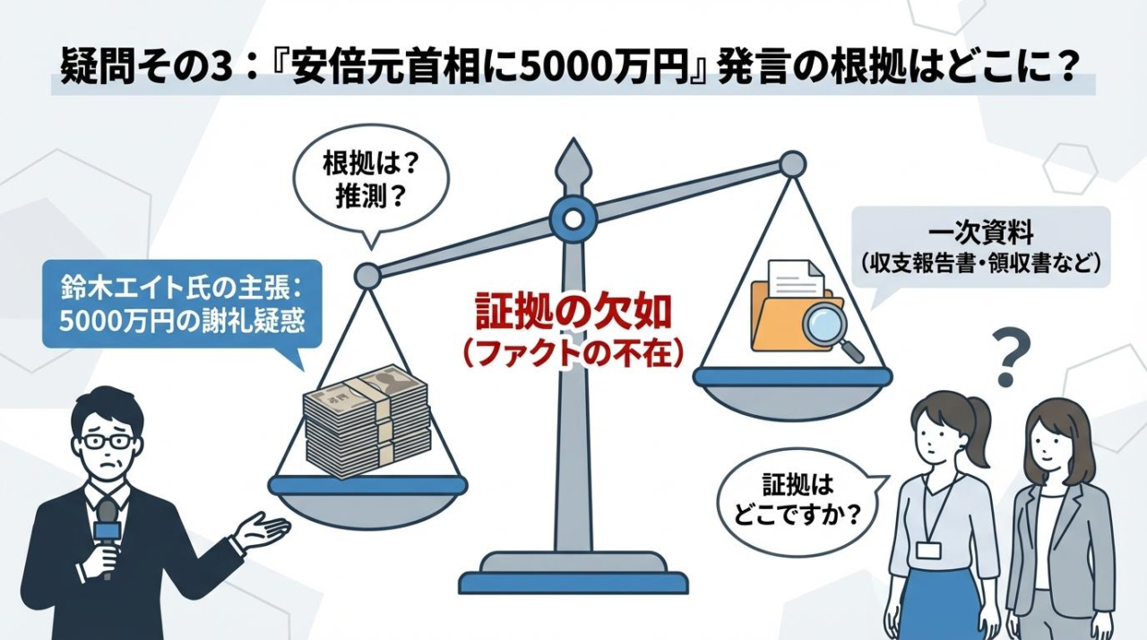 亡くなった安倍元首相の名誉にも深く関わる重大な問題です。証拠を出せないのなら、単なる「陰謀論」や「想像」だと言われても仕方がないのではないでしょうか。ここを曖昧にしたまま批判を続ける姿勢に、多くの人が疑問を抱き始めています。