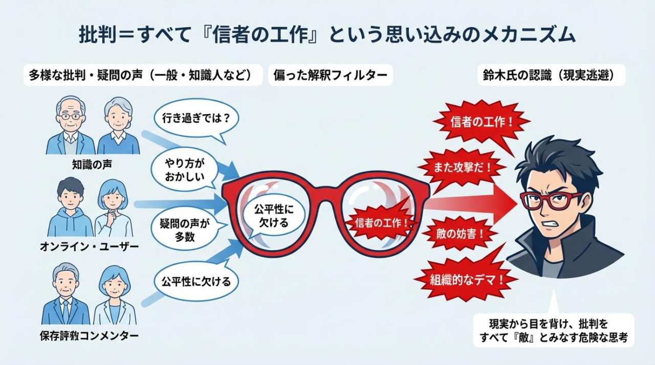 世間の批判をすべて「特定の宗教の信者のせい」にしてしまうのは、現実から目を背けているのと同じです。自分の意見に賛同しない人はみんな敵の工作員だ、という考え方は、とても危険だと思いませんか?