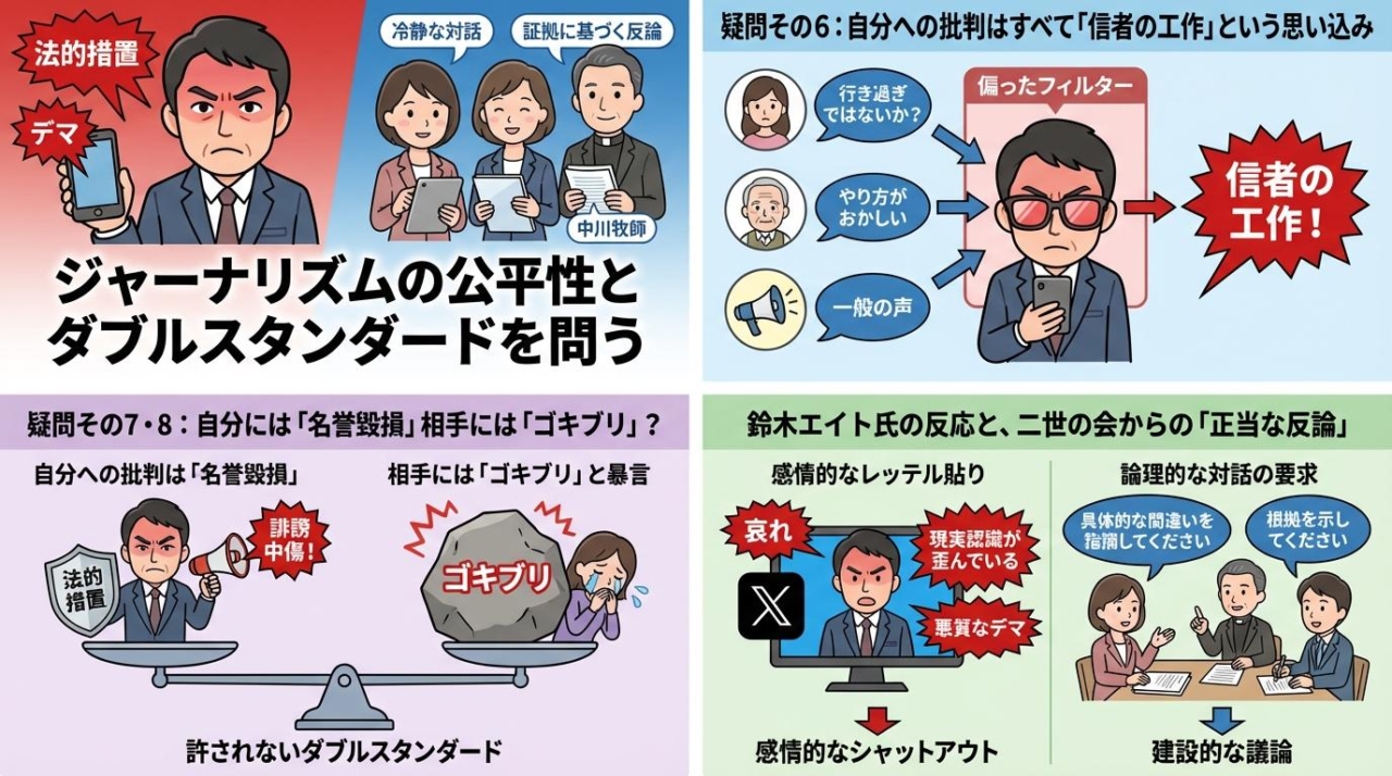 この記事では、中川牧師のYouTubeチャンネルでも取り上げられたこの話題について、彼女たちが鈴木エイト氏に突きつけた「8つの疑問」の中身を、一つひとつ分かりやすく紐解いていきます。