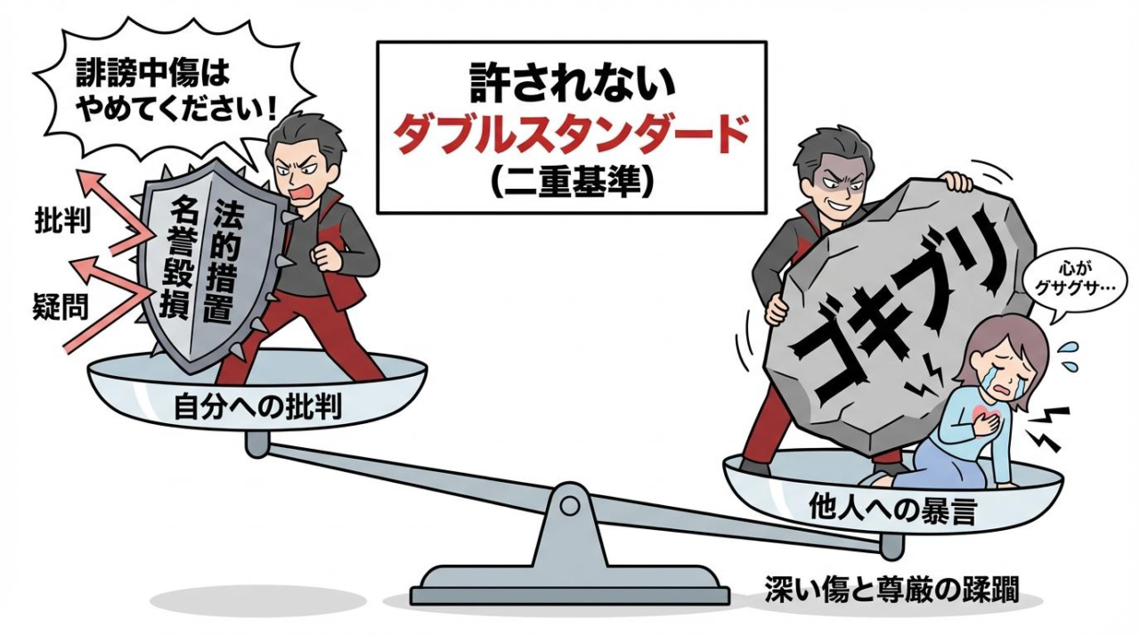 自分は相手の尊厳を踏みにじるような汚い言葉を平気で投げつけるのに、自分が批判された途端に「被害者」の顔をして法律を盾に取る。この明らかなダブルスタンダード(二重基準)に、多くの人が不信感を抱いています。