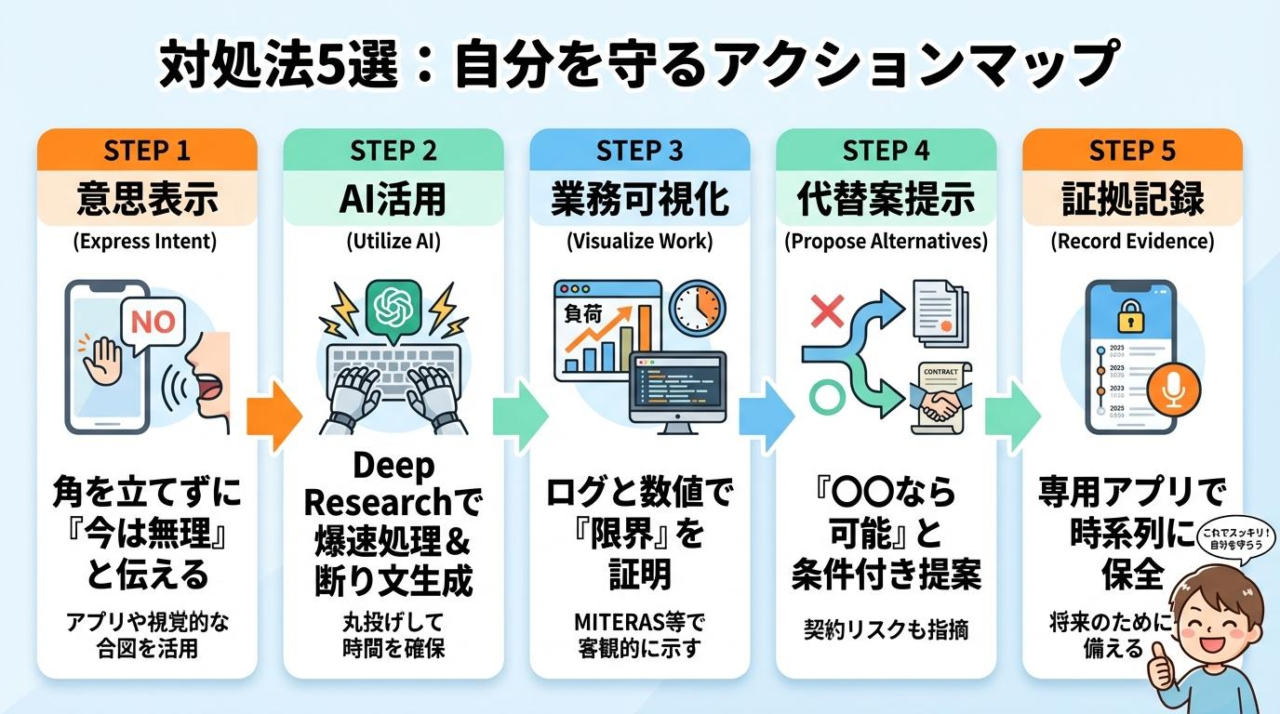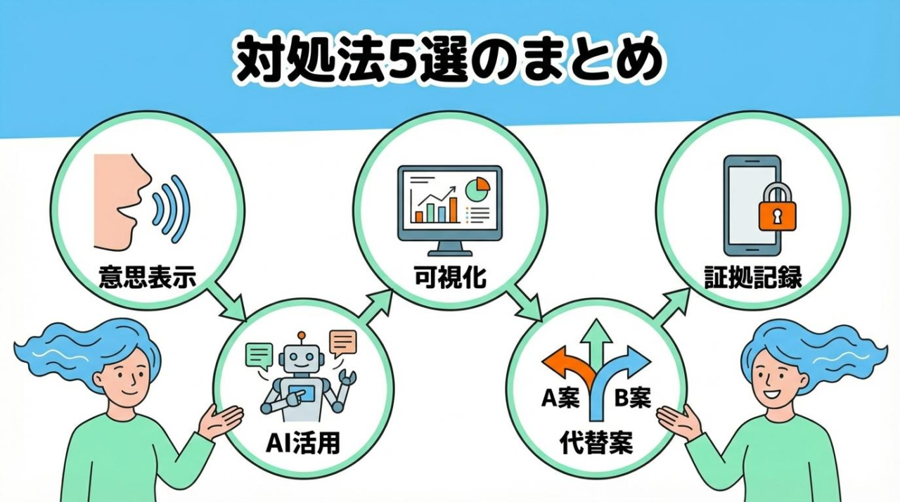ここからは、理不尽な押し付けに対して自分を守り、現状を打破するための具体的な5つのアクションを紹介します。