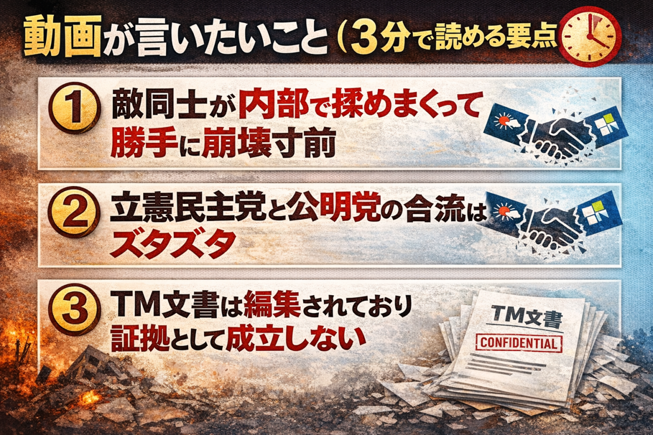 このブログは、YouTube「中川TV」の動画をもとに、話題になっている 「TM文書(トゥルーマザー文書/TM特別報告)」 と、公明党と立憲民主党が合意した新党構想をめぐる論点を、読みやすく整理したものです。