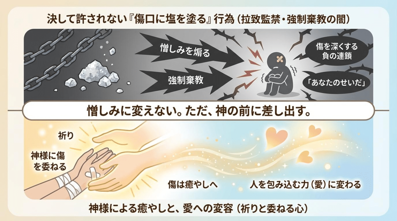 「自分の傷を、誰かを憎むために使うのではなく、そのまま神様に差し出してください」