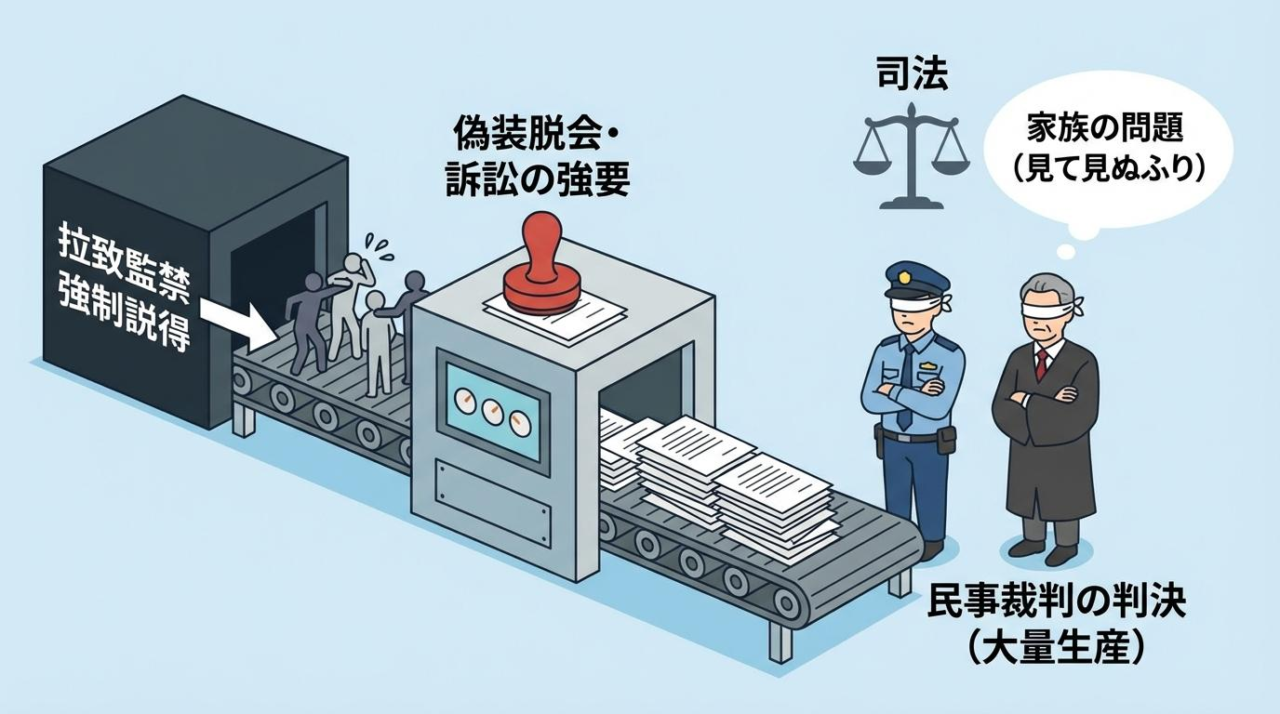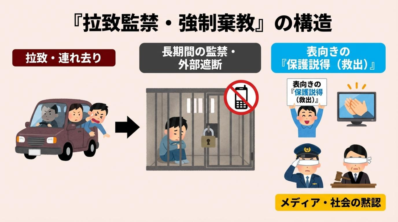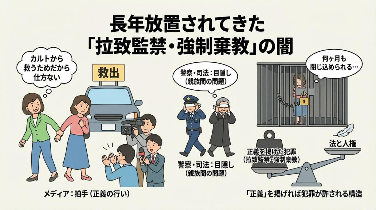 「救出」という言葉の響きに騙され、社会も、メディアも、そして本来なら犯罪を取り締まるべき警察や裁判所でさえも、「親族間の問題だから」「カルトから救うためだから仕方ない」と、この明らかな犯罪を見て見ぬふりをしてきました。