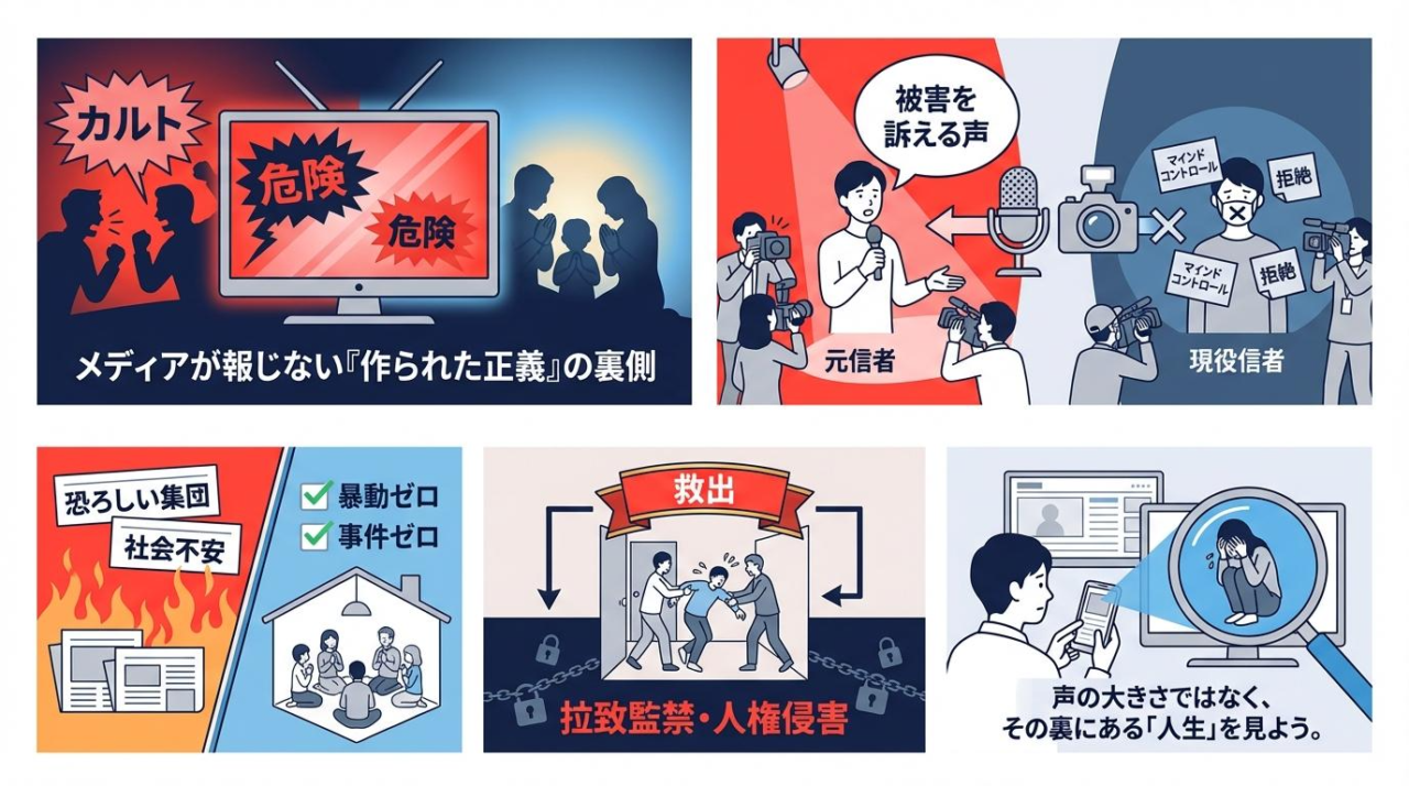 メディアは、「元信者」という肩書きを持つ人たちの声だけを「正義」として大きく取り上げます。彼らの悲痛な訴えはプロパガンダとして強力な効果を発揮します。
