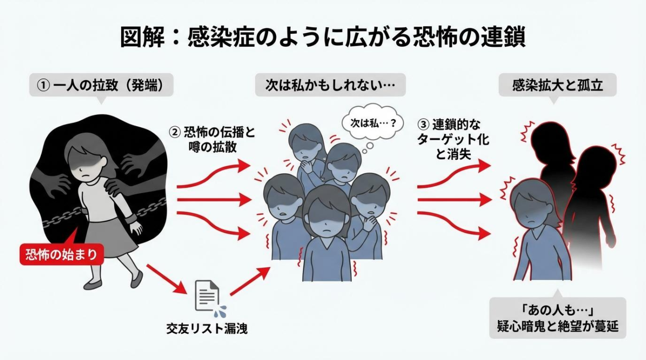 一人拉致されると、そこから交友関係のリストが漏れ、まるで感染症が広がるかのように、次々と周りの人がターゲットにされ、消えていくのです。「ああ、あの人も連れ去られた」「次は私かもしれない…」そんな恐怖に怯えながら毎日を過ごさなければならない状況を想像してみてください。どれほど生きた心地がしないでしょうか。